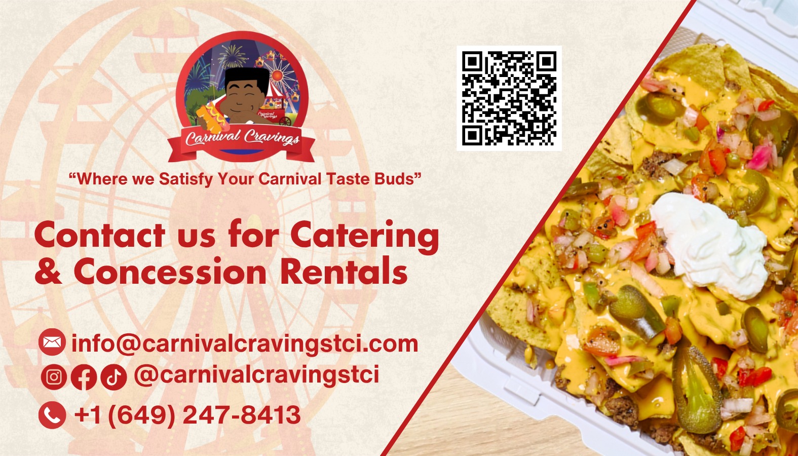 Carnival Cravings is a vibrant mobile food business in the Turks and Caicos Islands that brings the flavor and excitement of the carnival experience directly to our customers. We specialize in serving fresh, fun, and family-friendly foods that create memories at every event. From our mobile cart and food trailer, we serve communities at pop-ups, festivals, school events, sports days, church functions, and private celebrations. Our goal is simple: great food, excellent service, and joyful experiences for every guest we serve.